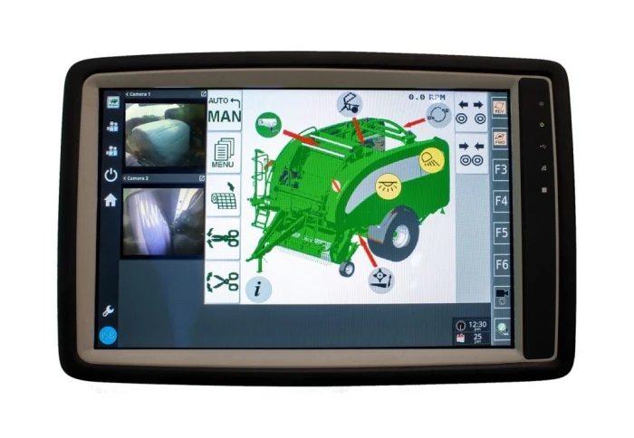 To alternative McHale ISOBUS-terminalerMcHale Fusion sitt ISOBUS-styresystem gjør at pressa kan betjenes via hvilken som helst ISOBUS-terminal. McHale tilbyr to alternative ISOBUS-terminaler, ISO-PLAY 7 eller ISO-PLAY 12, men skjermer på henvholdvis 7" og 12". Via ISOBUS-terminalen får føreren full oversikt og og intutiv betjening av pressa. Via terminalen kan føreren følge hele presse- og pakkeprosessen og se viktige operasjoner via pressas kameraer. . |